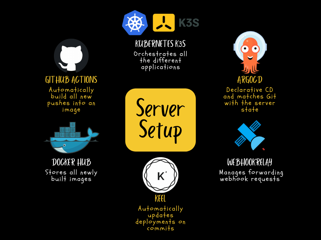 Now Kubernetes is a nice tool to orchestrate it all, but how do I add my nice Docker images to it all? One way would be to do some hacky local shenanigans to upload images to my server and have Kubernetes use them. This is a pretty annoying workflow though. I’d have to constantly connect to my Kubernetes cluster to upload the images and run them there. This is also not scalable to multiple nodes because I’d have to make sure every node has access to the local Docker image.